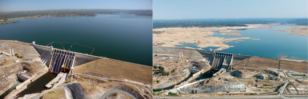 The climate crisis has severely impacted California’s water-energy nexus. Here we see the contrast between a full reservoir behind Folsom Dam in July 2011 compared to the water level under the extreme drought in January 2014.