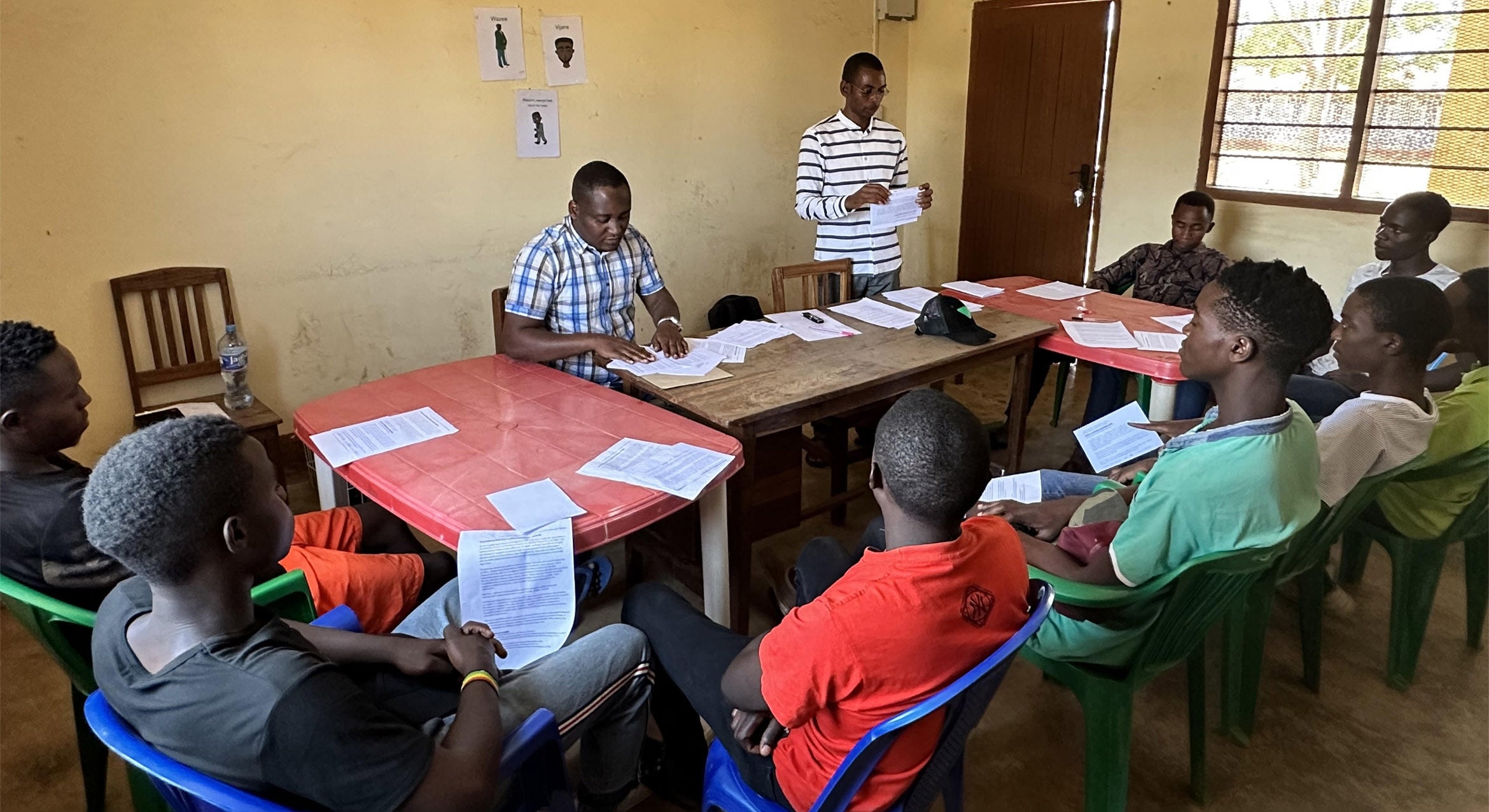 A focus group of young men in Tanzania, led by project co-investigator Alexander Ishungisa (standing) and social scientist Elisha Mabula. (Photograph shared with participant consent.)
